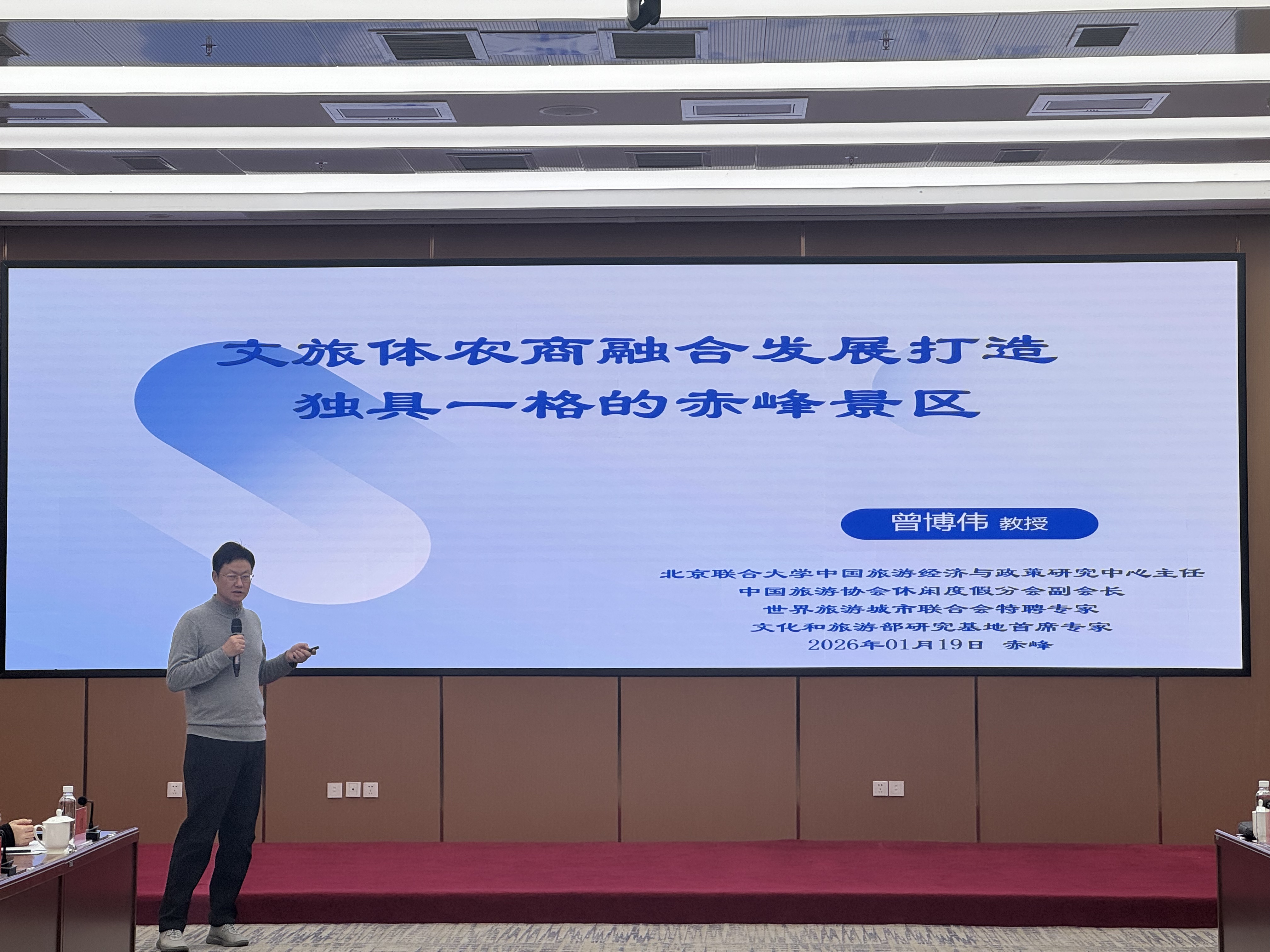 会议开篇设置专家授课环节,特邀两位国内知名文旅专家学者进行专题授课。北京联合大学中国旅游经济与政策研究中心主任曾博伟教授围绕“文旅体农商融合发展打造独具一格的赤峰景区”开展专题分享,从新消费背景下旅游景区标准化、品牌化、数智化等11个方面进行系统阐述,对赤峰市文旅体农商融合发展提出了发展思路。来自西北师范大学旅游学院硕士导师孙小荣教授结合国内典型案例与前沿趋势,从旧模式“固态景区”到新变革“液态旅游”,如何营造“场景”、创造“体验流”等方面进行了生动解析,对赤峰文旅品牌定位、产品创新、发展方向提出了很好建议。专家们的前沿观点与实操建议,为与会者提供了宝贵的理论指导和灵感启发。